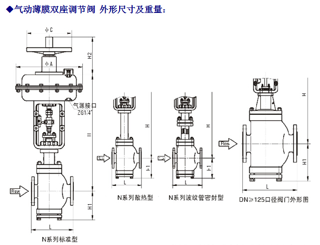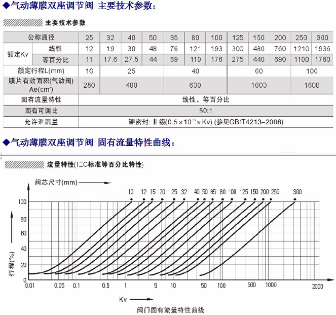 氣動(dòng)薄膜雙座調(diào)節(jié)閥系列產(chǎn)品有標(biāo)準(zhǔn)型、波紋管密封型、夾套保溫型等多種品種。產(chǎn)品公稱壓力等級(jí)有PN10、16、40、64;閥體口徑范圍DN20~200。適用流體溫度由-200℃~+560℃,其范圍內(nèi)多種檔次。泄漏量標(biāo)準(zhǔn)有II 級(jí)或IV級(jí)。流量特性為線性或等百分比。多種多樣的品種規(guī)格可供選擇。